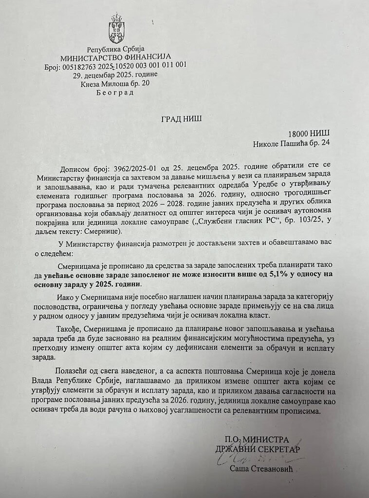 Ministarstvo finansija Republike Srbije ocenilo je negativnim planove rukovodstva Grada Niša da direktorima javnih preduzeća u 2026. godini drastično uvećaju zarade. Iako je niška Skupština krajem decembra izglasala programe poslovanja koji predviđaju povišice od 70% do 110%, državni sekretar Saša Stevanović upozorio je gradsku vlast da uvećanje osnovice ne sme preći 5,1 odsto.