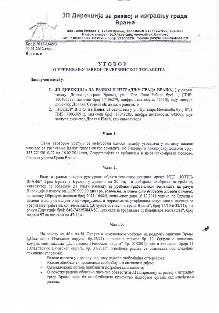 Kao ključni dokaz o izmirenim obavezama prema Gradu Vranju, dostavljen nam je i Ugovor o uređivanju javnog građevinskog zemljišta iz 2012. godine. Ovim ugovorom, zaključenim sa tadašnjom Direkcijom za razvoj i izgradnju, Jotel se obavezao na plaćanje naknade od 1.120.000,00 dinara za izgradnju telekomunikacione mreže u dužini od 20 kilometara.