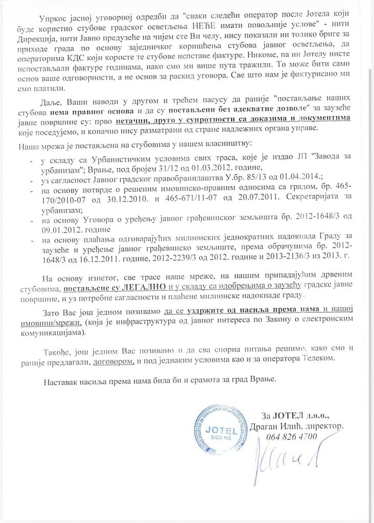 U zvaničnom dopisu upućenom JP „Urbanizam i izgradnja“, kompanija Jotel naglašava da prvostepeni organ nije poništio niti ukinuo njihovu građevinsku dozvolu. Navodi se da je samo konstatovan prestanak pravnog osnova za korišćenje gradskih svetiljki na malom delu trase, zbog čega je operater pokrenuo spor pred Upravnim sudom.