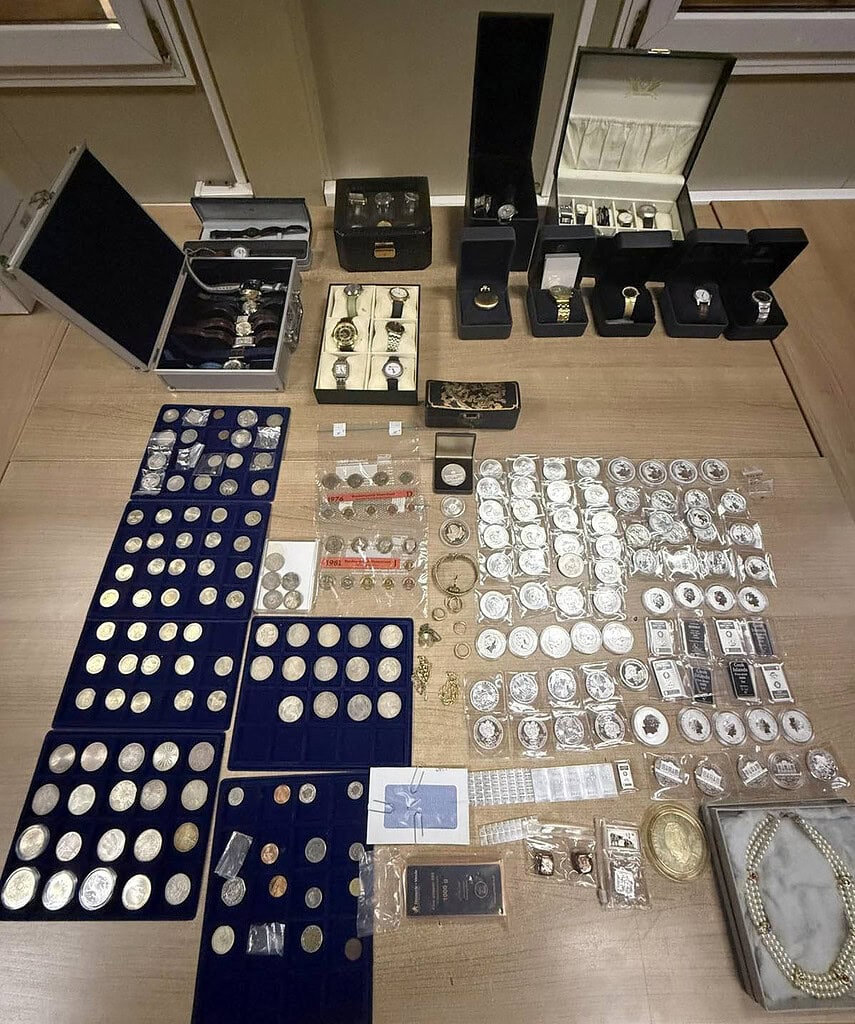 „Pronađena je kolekcionarska zbirka, u kojoj se našla jedna masivna biserna ogrlica ukrašena raznobojnim kamenjem, 10 komada zlatnog nakita, 186 srebrnjaka iz različitih perioda, 60 srebrnih prstenova, 37 korišćenih časovnika i jedan kamen jarko crvene boje nalik na rubin.“