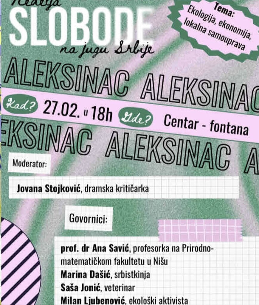 Nakon Prokuplja, Leskovca, Pirota i Vranja, velika završnica serije tribina „Nedelja slobode“ održaće se u petak, 27. februara, u centru Aleksinca. Pod sloganom „Pet dana, pet gradova, jedna poruka – sloboda“, studenti i građani juga Srbije šalju jasan apel za pravdu, istinu i funkcionalnu državu.