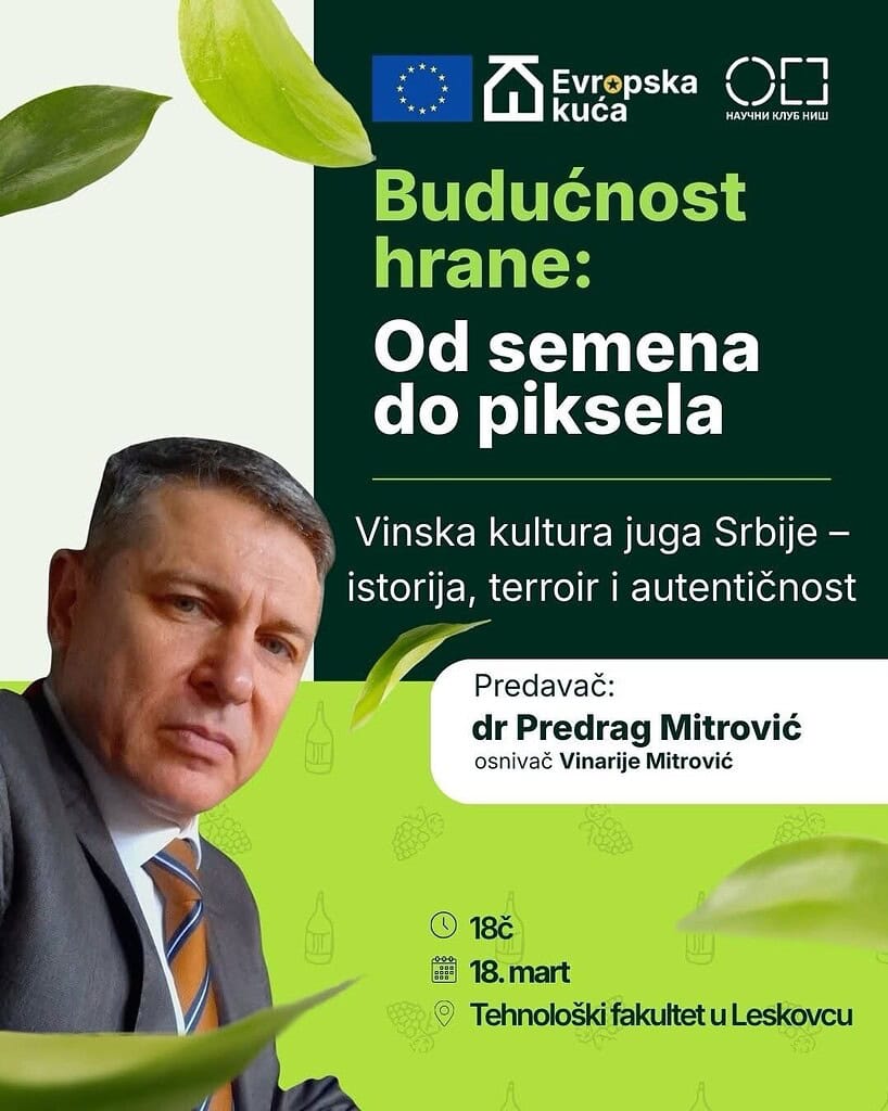 Tehnološki fakultet u Leskovcu biće domaćin predavanja o vinskoj kulturi i istoriji juga Srbije, koje će u sredu, 18. marta, održati dr Predrag Mitrović, vlasnik Vinarije Mitrović. Predavanje počinje u 18 sati u svečanoj sali fakulteta, a obuhvatiće istorijski razvoj vinogradarstva u regionu i radionicu senzorne analize vina.