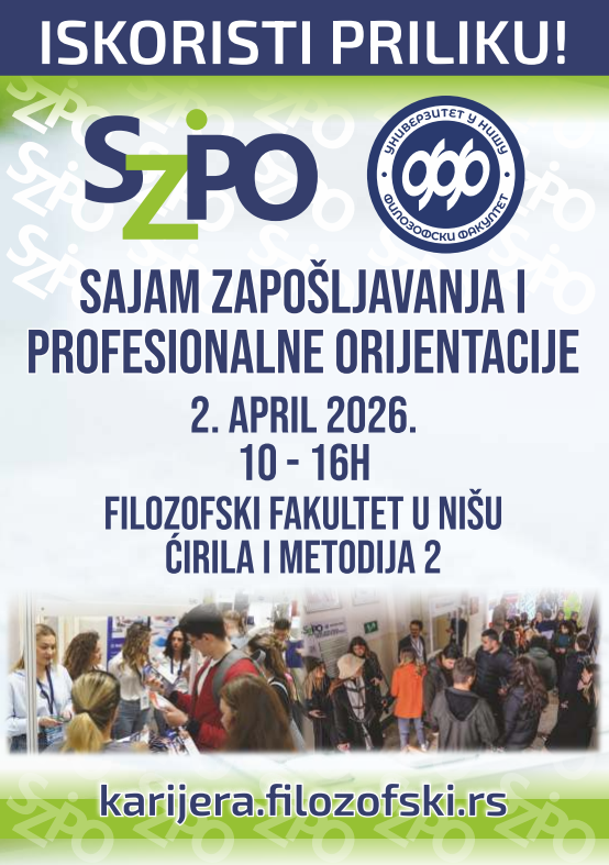 Sajam zapošljavanja i profesionalne orijentacije biće održan 2. aprila od 10 do 16 časova u prostorijama Filozofskog fakulteta u Nišu, koji je i jedan od ključnih nosilaca organizacije ovog događaja, uz najavu bogatog programa namenjenog svima koji traže posao, praksu ili žele da unaprede svoje karijerne veštine.