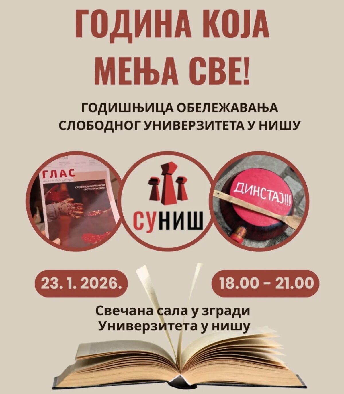 Pod sloganom „GODINA KOJA MENJA SVE!“, Slobodni univerzitet u Nišu obeležiće u petak, 23. januara, godišnjicu svog postojanja. Veliki skup, koji spaja akademsku debatu i umetnički program, b...