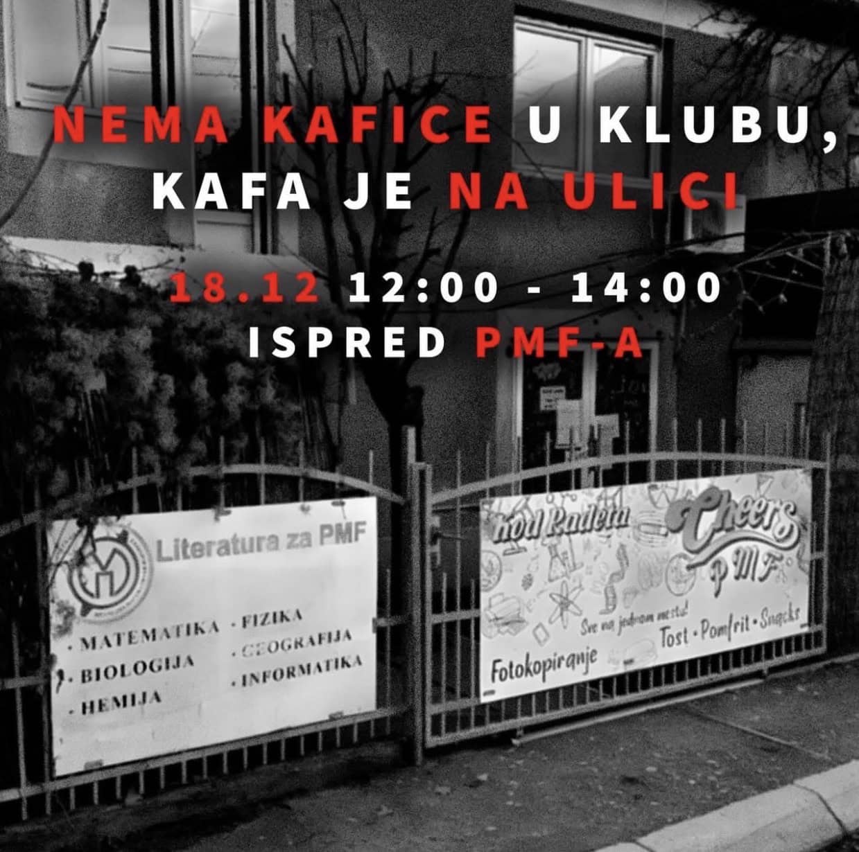 Nakon što je inspekcija zatvorila studentski kafić „Cheers PMF“, studenti Prirodno-matematičkog fakulteta u Nišu organizuju sutra, 18. decembra, od 12 do 14 časova, simboličnu akciju pod nazivom&...