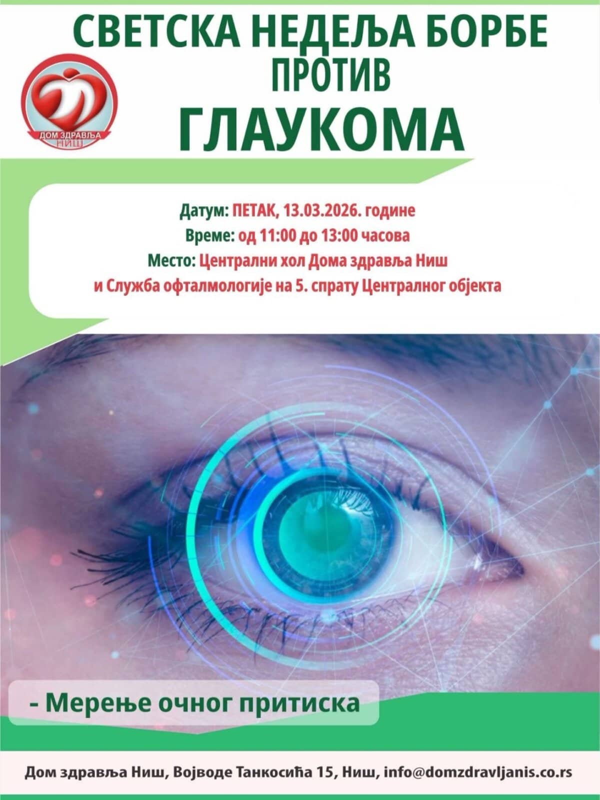 Povodom Svetske nedelje borbe protiv glaukoma, Dom zdravlja Niš organizuje akciju „Otvorena vrata“. Građani će u petak moći da provere očni pritisak bez knjižice i zakazivanja....