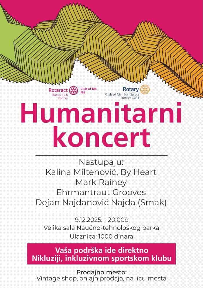 Rotarakt klub Niš poziva na humanitarni koncert u velikoj sali Naučno-tehnološkog parka Niš – večeras, 9. decembra u 20 sati. Organizatori navode da je cilj prikupljanje sredstava za p...