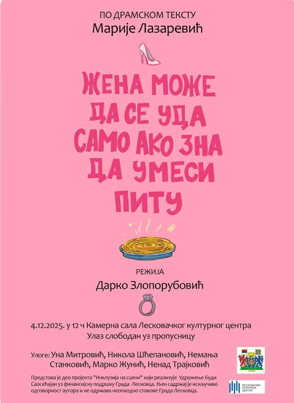 Pred leskovačkom publikom 4. decembra u podne naći će se pozorišna predstava „Žena može da se uda samo ako zna da umesi pitu“, po dramskom tekstu Marije Lazarević, u režiji Darka Zloporubo...